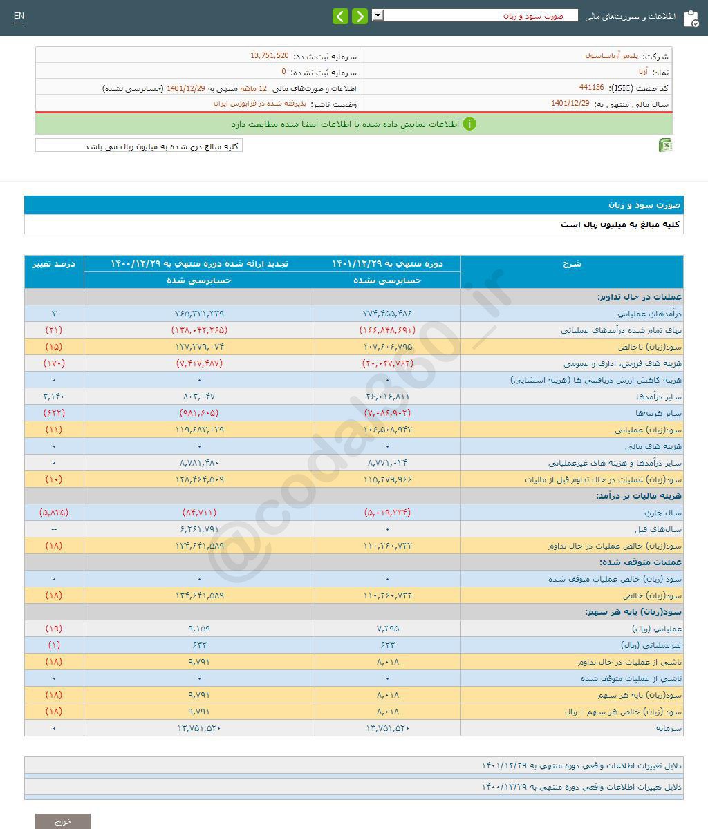 بر اساس بررسی گزارش صورتهای مالی سال مالی منتهی به ۱۴۰۱/۱۲/۲۹ (حسابرسی نشده) شرکت پلیمر آریاساسول که با نماد آریا در بورس فعالیت دارد؛