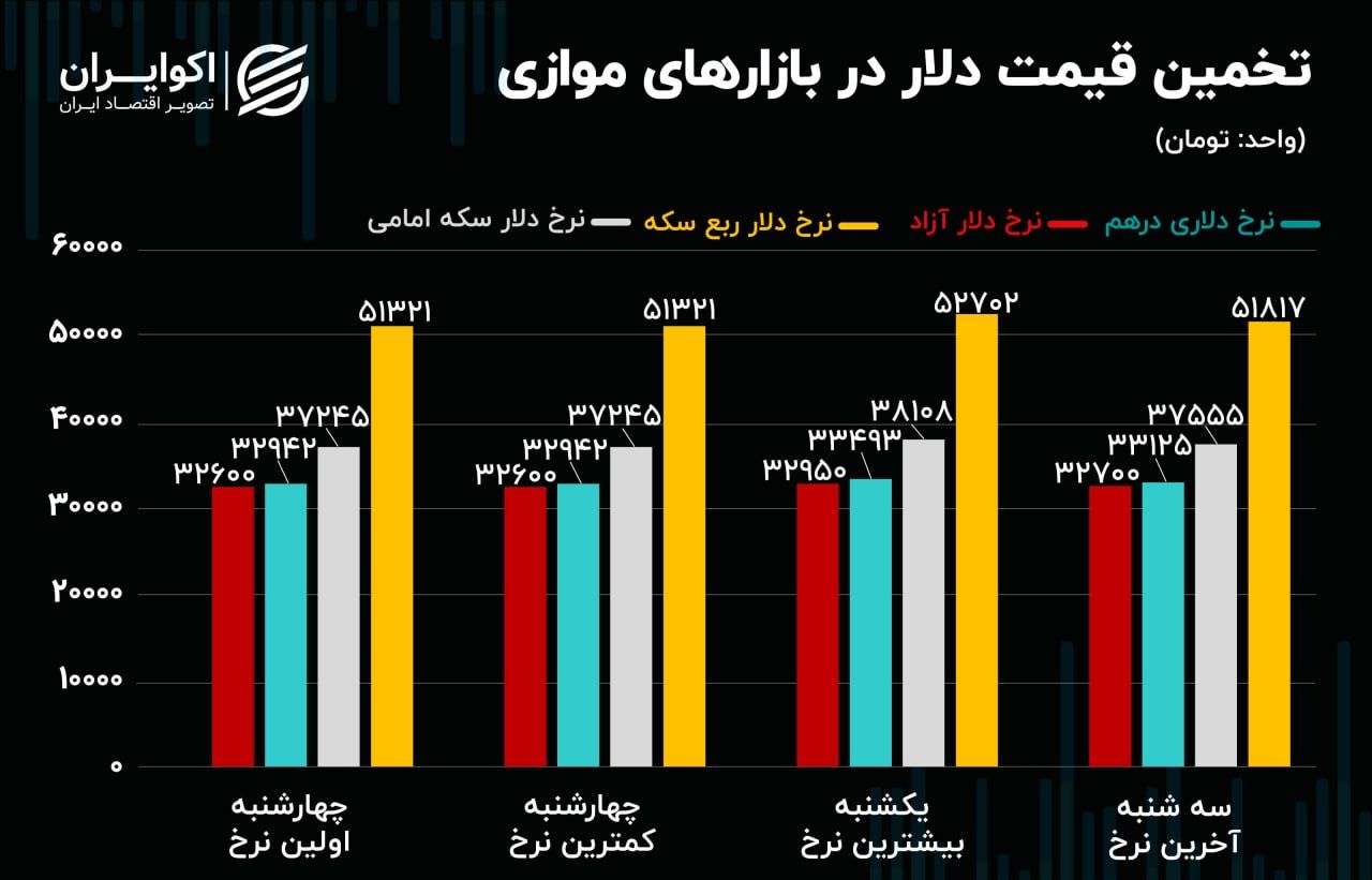 اکوایران قیمت پایانی دلار در بازارهای مختلف را در هر روز محاسبه میکند و در نمودار اولین، کمترین، بالاترین و آخرین قیمت هفته منتهی به آن روز را قرار میدهد.