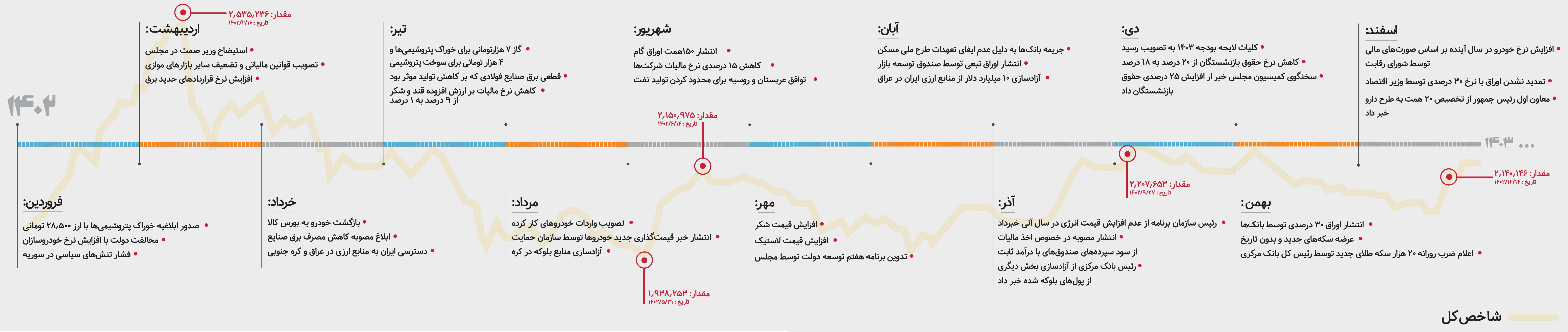 این اتفاقات شامل مصوبههای دولت، بانک مرکزی و تنشهای منطقهای و جهانی است. براین اساس اتفاقات مهم تاثیرگذار بر اقتصاد ایران را در تصویر مشاهده میکنید.