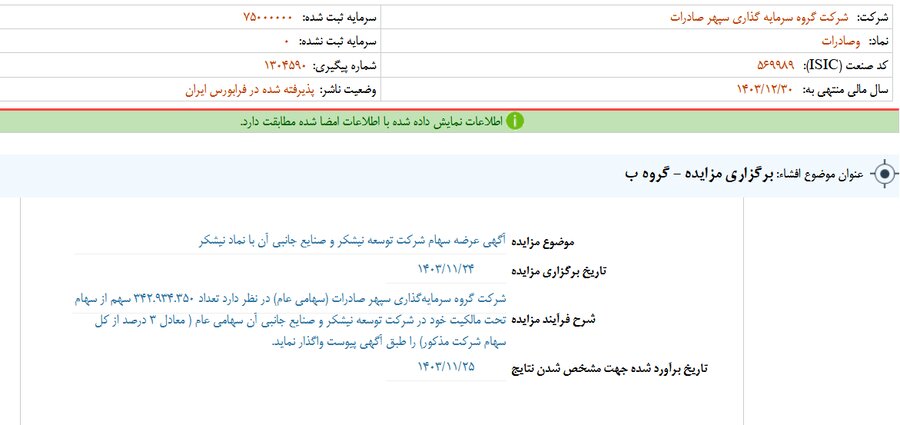 شرکت گروه سرمایه‌گذاری سپهر صادرات (سهامی عام) در نظر دارد تعداد ۳۴۲.۹۳۴.۳۵۰ سهم از سهام تحت مالکیت خود در شرکت توسعه نیشکر و صنایع جانبی آن سهامی عام ( معادل ۳ درصد از کل سهام شرکت مذکور) را طبق آگهی واگذار کند.