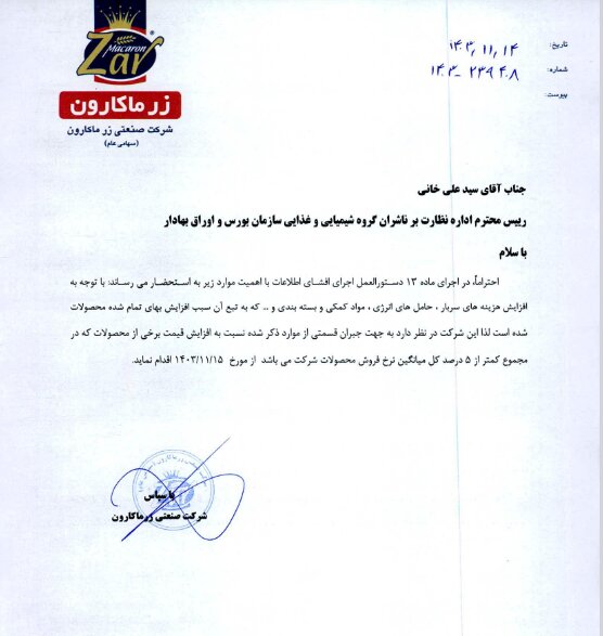 در اجرای ماده ۱۳ دستورالعمل اجرای افشای اطلاعات با اهمیت موارد زیر به استحضار می رساند؛ با توجه به افزایش هزینه های سربار ، حامل های انرژی ، مواد کمکی و بسته بندی و ... که به تبع آن سبب افزایش بهای تمام شده محصولات شده است لذا این شرکت در نظر دارد به جهت جبران قسمتی از موارد ذکر شده نسبت به افزایش قیمت برخی از محصولات که در مجموع کمتر از ۵ درصد کل میانگین نرخ فروش محصولات شرکت است از مورخ ۱۴۰۳/۱۱/۱۵ اقدام کند.