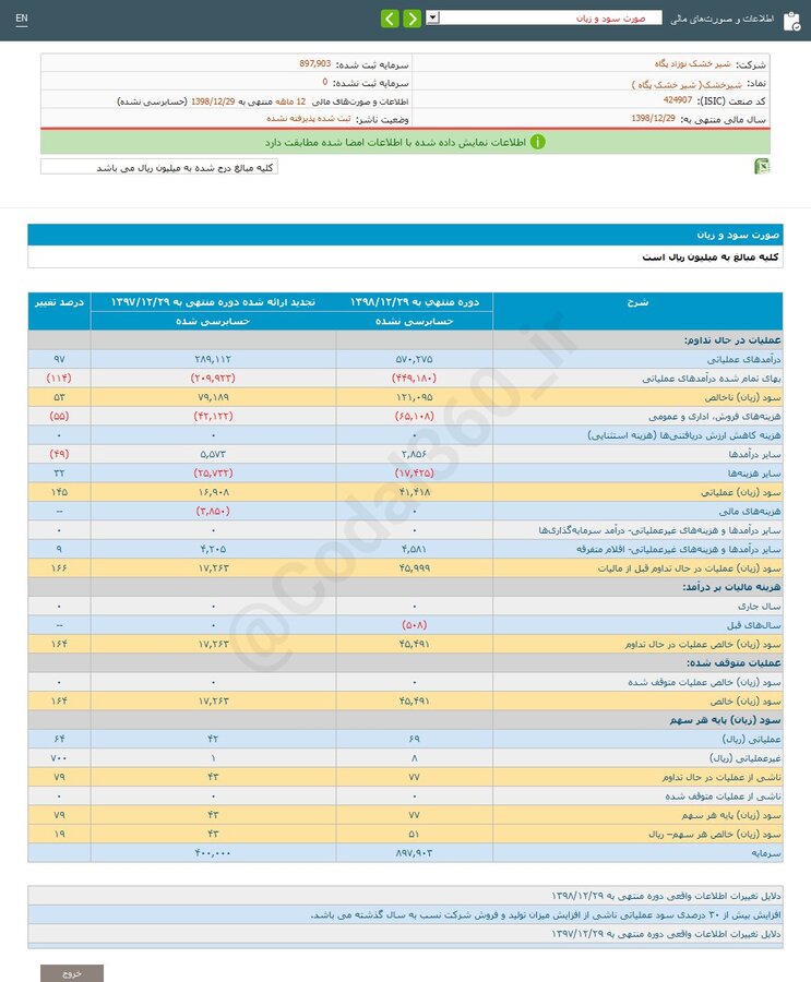 بر اساس بررسی گزارش صورتهای مالی سال مالی منتهی به ۱۳۹۸/۱۲/۲۹ (حسابرسی نشده) شرکت شیرخشک مشخص شد؛