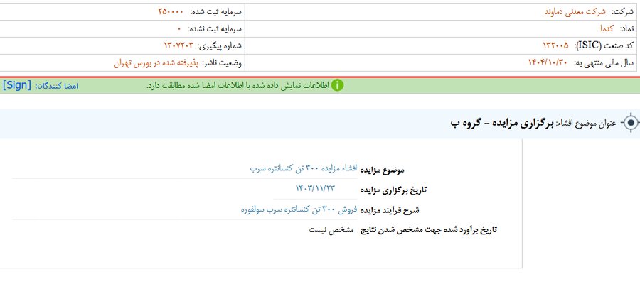 بر اساس انتشار گزارش افشای اطلاعات بااهمیت - (برگزاری مزایده - گروه ب) منتهی به سال مالی ۱۴۰۴/۱۰/۳۰ کدما مشخص شد.