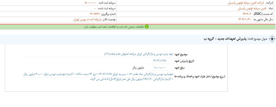 بر اساس انتشار گزارش افشای اطلاعات بااهمیت - (پذیرش تعهدات جدید - گروه ب) منتهی به سال مالی ۱۴۰۴/۱۰/۳۰ لوتوس مشخص شد،