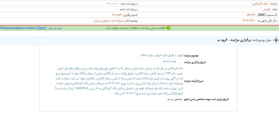 گزارش افشای اطلاعات بااهمیت - (برگزاری مزایده - گروه ب) منتهی به سال مالی ۱۴۰۳/۱۲/۳۰ وگردش منتشر شد.
