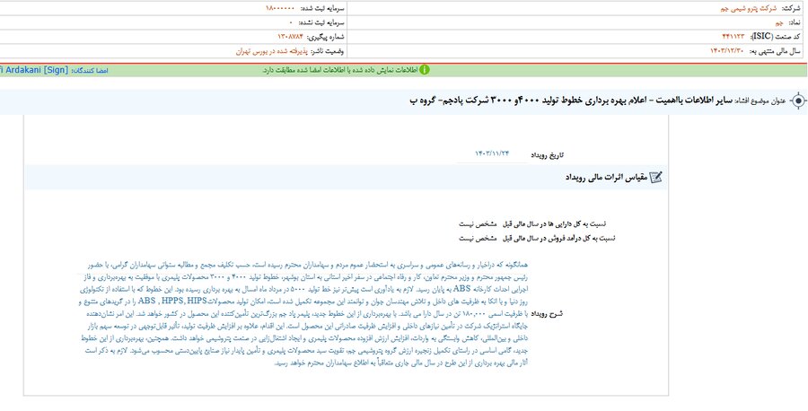 بر اساس انتشار گزارش افشای اطلاعات بااهمیت - (سایر اطلاعات بااهمیت - اعلام بهره برداری خطوط تولید ۴۰۰۰و ۳۰۰۰ شرکت پادجم- گروه ب) منتهی به سال مالی ۱۴۰۳/۱۲/۳۰ جم مشخص شد.