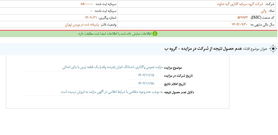 بر اساس انتشار گزارش افشای اطلاعات بااهمیت - (عدم حصول نتیجه از شرکت در مزایده - گروه ب) منتهی به سال مالی ۱۴۰۴/۰۹/۳۰ وآتی مشخص شد؛