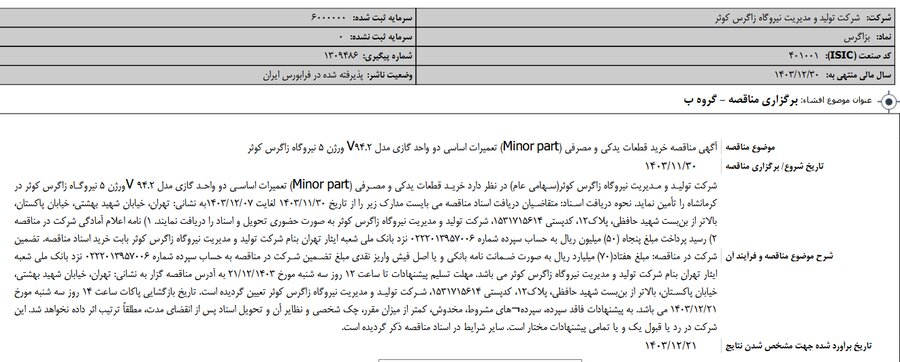گزارش افشای اطلاعات بااهمیت - (برگزاری مناقصه - گروه ب) منتهی به سال مالی ۱۴۰۳/۱۲/۳۰ بزاگرس منتشر شد.