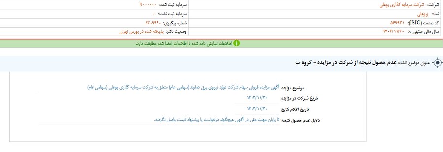 بر اساس انتشار گزارش افشای اطلاعات بااهمیت - (عدم حصول نتیجه از شرکت در مزایده - گروه ب) منتهی به سال مالی ۱۴۰۳/۱۱/۳۰ وبوعلی مشخص شد.