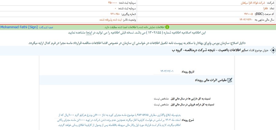 گزارش افشای اطلاعات بااهمیت - (سایر اطلاعات بااهمیت - نتیجه شرکت درمناقصه- گروه ب) منتهی به سال مالی ۱۴۰۳/۱۲/۳۰(اصلاحیه) فافزا منتشر شد.