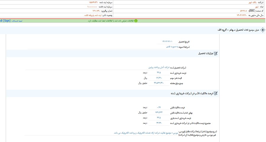بر اساس انتشار گزارش افشای اطلاعات بااهمیت - (تحصیل سهام - گروه الف) منتهی به سال مالی ۱۴۰۳/۱۲/۳۰ وشهر مشخص شد،