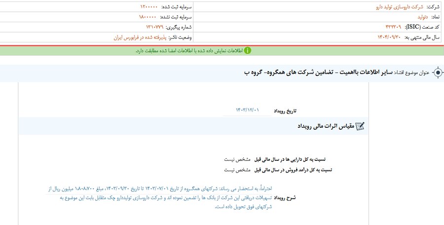 بر اساس انتشار گزارش افشای اطلاعات بااهمیت - (سایر اطلاعات بااهمیت - تضامین شرکت های همگروه- گروه ب) منتهی به سال مالی ۱۴۰۴/۰۹/۳۰ دتولید مشخص شد.