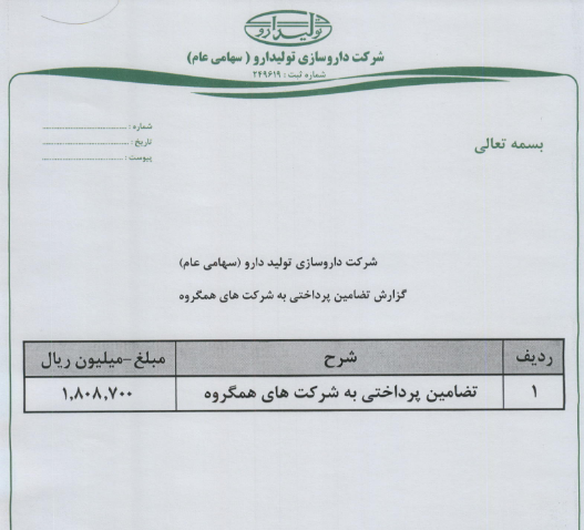 شرکتهای همگـروه از تاریخ ۱۴۰۳/۰۷/۰۱ تا تاریخ ۱۴۰۳/۰۹/۳۰، مبلغ ۱۸۰ میلیارد تومان از تسهیلات دریافتی این شرکت از بانک ها را تضمین نموده اند و شرکت داروسازی تولیددارو چک متقابل بابت این موضوع به شرکتهای فوق تحویل داده است.
