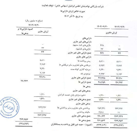 بر این اساس صورت خالص ارزش دارایی های شرکت نواندیشان اطلس به این شرح است، جمع دارایی ها ۲.۶ میلیارد تومان برای دوره مالی منتهی به ۱۴۰۳/۰۹/۳۰ است.جمع بدهی های شرکت ۲۶.۴ میلیارد تومان است.
