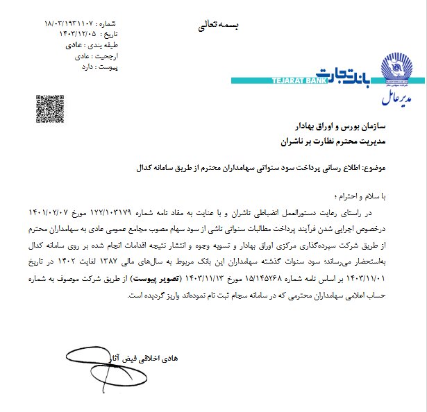 در راستای رعایت دستورالعمل انضباطی ناشران و با عنایت به مفاد نامه شماره ۱۲۲/۱۰۳۱۷۹ مورخ ۱۴۰۱/۰۲/۰۷ در خصوص اجرایی شدن فرآیند پرداخت مطالبات سنواتی ناشی از سود سهام مصوب مجامع عمومی عادی به سهامداران محترم از طریق شرکت سپرده گذاری مرکزی اوراق بهادار و تسویه وجوه و انتشار نتیجه اقدامات انجام شده بر روی سامانه کدال به استحضار می رساند؛ سود سنوات گذشته سهامداران این بانک مربوط به سالهای مالی ۱۳۸۷ لغایت ۱۴۰۲ در تاریخ ۱۴۰۳/۱۱/۰۱ بر اساس نامه مورخ ۱۴۰۳/۱۱/۱۳ تصویر (پیوست از طریق شرکت موصوف به شماره حساب اعلامی سهامداران محترمی که در سامانه سجام ثبت نام نکرده اند واریز شده است.