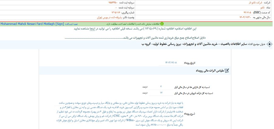 گزارش افشای اطلاعات بااهمیت - (سایر اطلاعات با اهمیت - خرید ماشین آلات و تجهیزات- بروز رسانی خطوط تولید- گروه ب) منتهی به سال مالی ۱۴۰۳/۱۲/۳۰(اصلاحیه) تکنو منتشر شد.