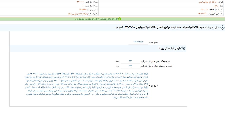 گزارش افشای اطلاعات بااهمیت - (سایر اطلاعات بااهمیت - عدم نتیجه موضوع افشای اطلاعات با کد پیگیری ۱۳۰۳۰۹۷- گروه ب) منتهی به سال مالی ۱۴۰۳/۱۲/۳۰ مداران منتشر شد.