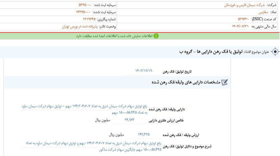 گزارش افشای اطلاعات بااهمیت - (توثیق یا فک رهن دارایی ها - گروه ب) منتهی به سال مالی ۱۴۰۴/۰۲/۳۱ سفارس منتشر شد.