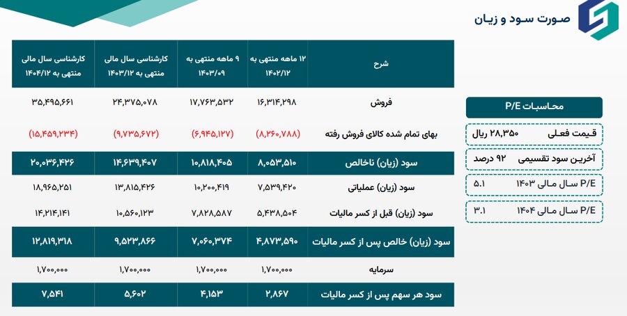 همچنین P/E شرکت برای دوره مالی منتهی به ۱۴۰۴ حدود ۳.۱ واحد است.
