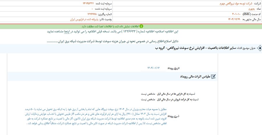 بر اساس انتشار گزارش افشای اطلاعات بااهمیت - (سایر اطلاعات بااهمیت - افزایش نرخ سوخت نیروگاهی- گروه ب) منتهی به سال مالی ۱۴۰۴/۱۲/۲۹(اصلاحیه) بجهرم مشخص شد.