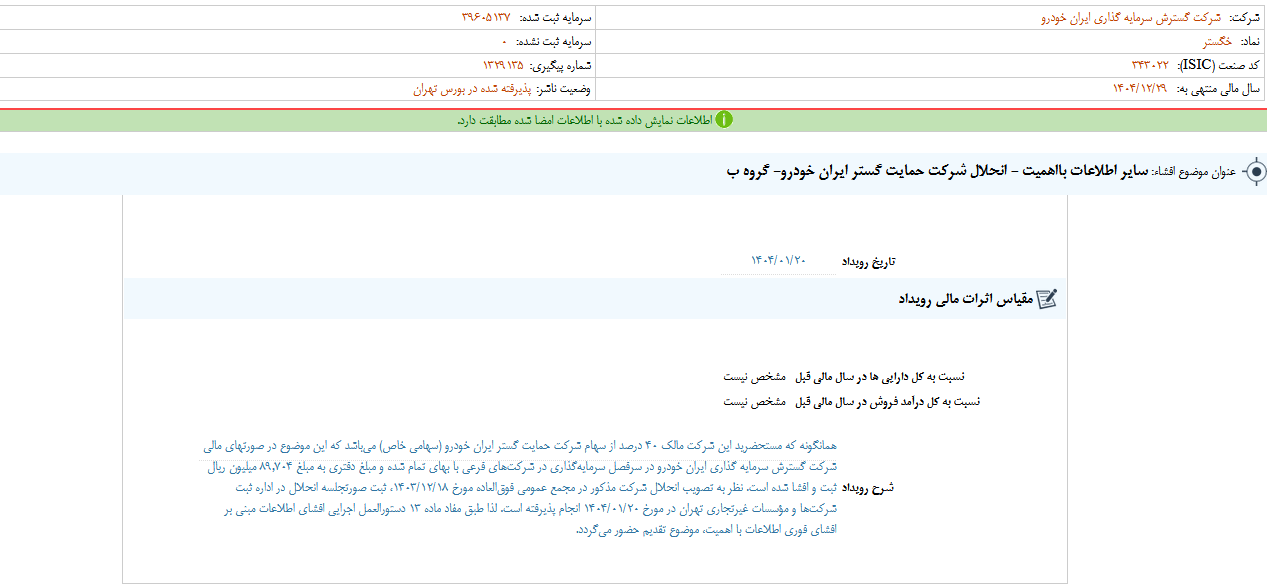 گزارش افشای اطلاعات بااهمیت - (سایر اطلاعات بااهمیت - انحلال شرکت حمایت گستر ایران خودرو- گروه ب) منتهی به سال مالی ۱۴۰۴/۱۲/۲۹خگستر منتشر شد.