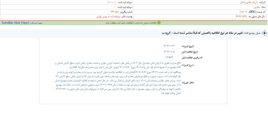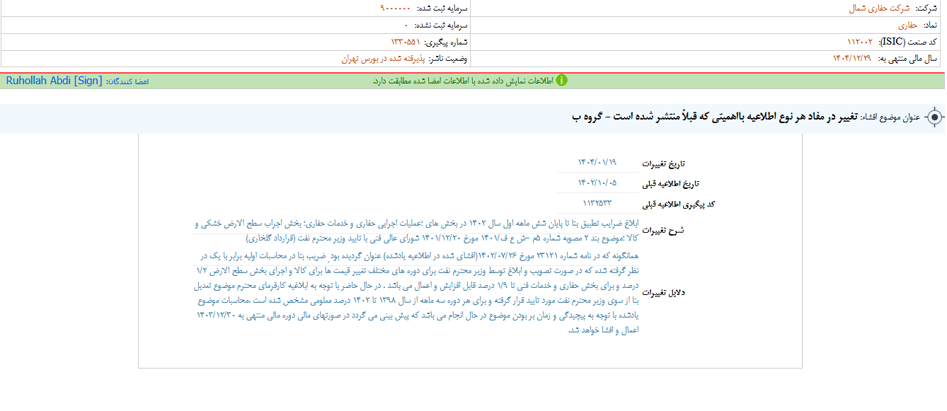 بر اساس انتشار گزارش افشای اطلاعات بااهمیت - (تغییر در مفاد هر نوع اطلاعیه بااهمیتی که قبلاً منتشر شده است - گروه ب) منتهی به سال مالی ۱۴۰۴/۱۲/۲۹ حفاری مشخص شد.