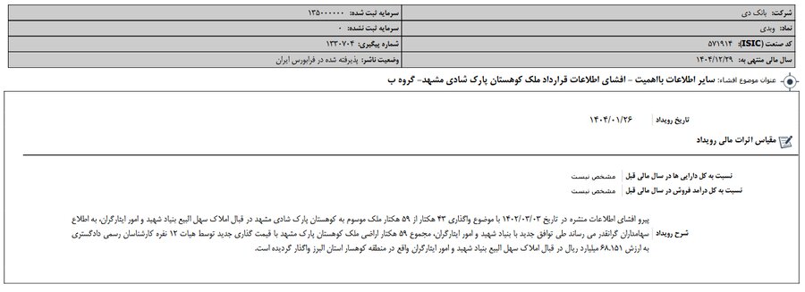 گزارش افشای اطلاعات بااهمیت - (سایر اطلاعات بااهمیت - افشای اطلاعات قرارداد ملک کوهستان پارک شادی مشهد- گروه ب) منتهی به سال مالی ۱۴۰۴/۱۲/۲۹(اصلاحیه) دی منتشر شد.