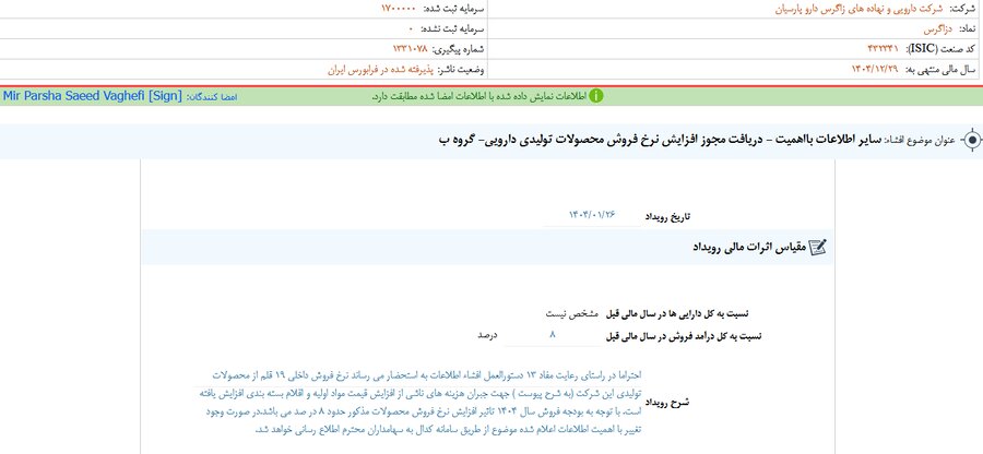 بر اساس انتشار گزارش افشای اطلاعات بااهمیت - (سایر اطلاعات بااهمیت - دریافت مجوز افزایش نرخ فروش محصولات تولیدی دارویی- گروه ب) منتهی به سال مالی ۱۴۰۴/۱۲/۲۹ دزاگرس مشخص شد.