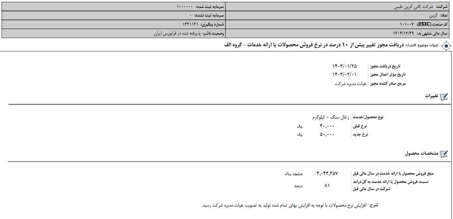 افشای اطلاعات بااهمیت - (دریافت مجوز تغییر بیش از ۱۰ درصد در نرخ فروش محصولات یا ارائه خدمات - گروه الف) منتهی به سال مالی ۱۴۰۴/۱۲/۲۹(اصلاحیه) کربن منتشر شد.