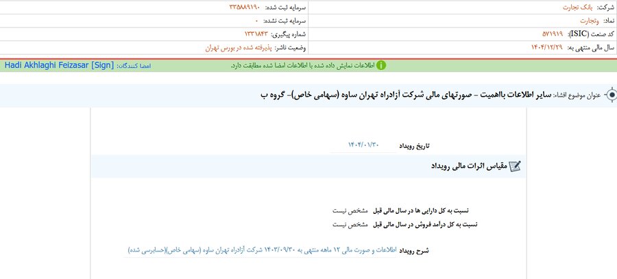 گزارش افشای اطلاعات بااهمیت - (سایر اطلاعات بااهمیت - صورتهای مالی شرکت آزادراه تهران ساوه (سهامی خاص)- گروه ب) منتهی به سال مالی ۱۴۰۴/۱۲/۲۹ وتجارت منتشر شد.