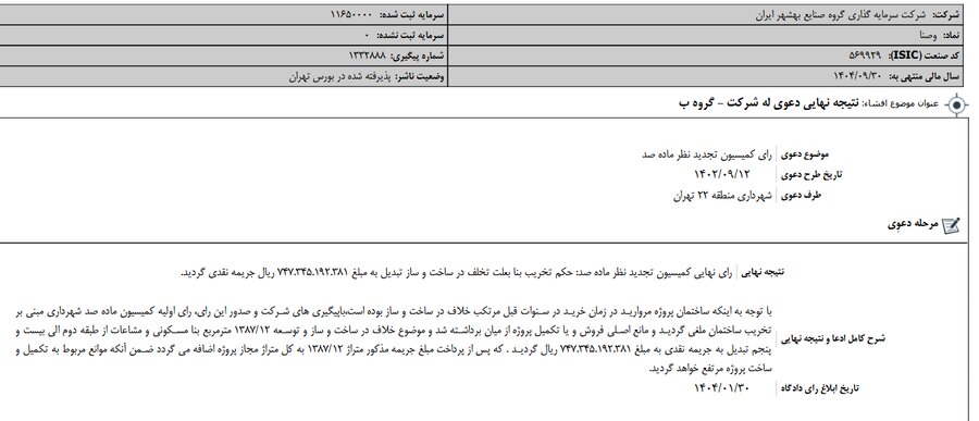 گزارش افشای اطلاعات بااهمیت - (نتیجه نهایی دعوی له شرکت - گروه ب) منتهی به سال مالی ۱۴۰۴/۰۹/۳۰ وصنا منتشر شد.
