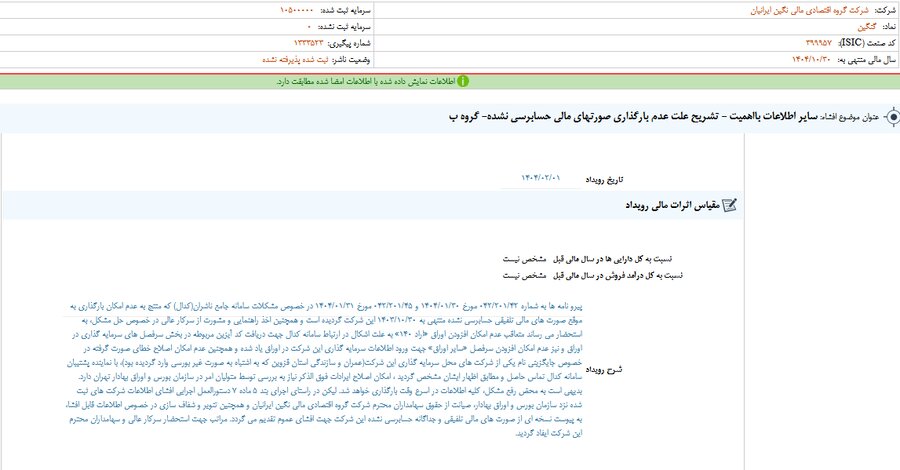به گزارش صدای بورس، شرکت گروه اقتصادی مالی نگین ایرانیان علت عدم بارگذاری صورتهای مالی حسابرسی نشده را توضیح داد.