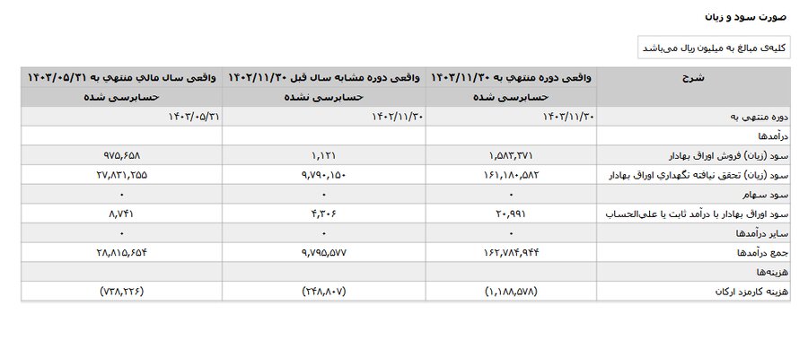 سود فروش اوراق بهادار شرکت ۱۵۸ میلیارد تومان است. همچنین سود خالص شرکت مبلغ ۱۶۱۱۹ میلیارد تومان است.