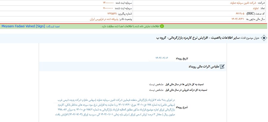 بر اساس انتشار گزارش افشای اطلاعات بااهمیت - (سایر اطلاعات بااهمیت - افزایش نرخ کارمزد بازارگردانی- گروه ب) منتهی به سال مالی ۱۴۰۴/۰۶/۳ تماوند مشخص شد.