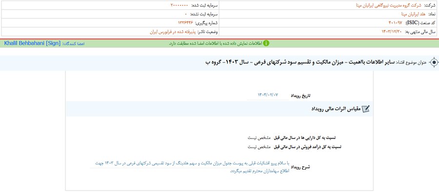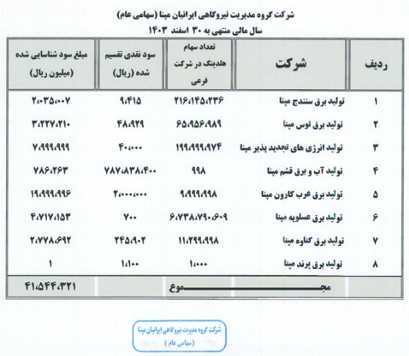 پیرو افشائیات قبلی به پیوست جدول میزان مالکیت و سهم هلدینگ از سود تقسیمی شرکتهای فرعی در سال ۱۴۰۳ جهت اطلاع سهامداران محترم تقدیم می شود.