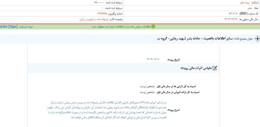 بر اساس انتشار گزارش افشای اطلاعات بااهمیت - (سایر اطلاعات بااهمیت - حادثه بندر شهید رجایی- گروه ب) منتهی به سال مالی ۱۴۰۴/۱۲/۲۹ ومعلم مشخص شد.