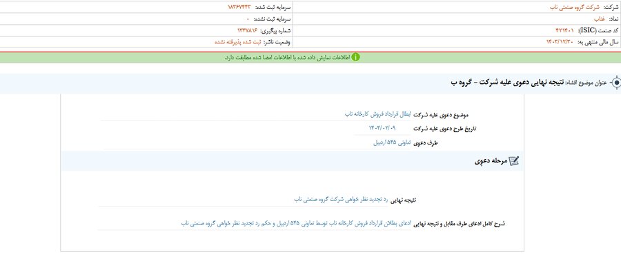 گزارش افشای اطلاعات بااهمیت - (نتیجه نهایی دعوی علیه شرکت - گروه ب) منتهی به سال مالی ۱۴۰۳/۱۲/۳۰ غناب منتشر شد.