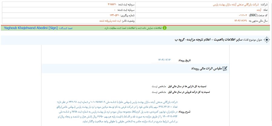 به گزارش صدای بورس، شرکت بازرگانی صنعتی آینده سازان بهشت پارس از اعلام نتیجه مزایده- گروه ب منتهی به سال مالی ۱۴۰۴/۱۲/۲۹ خبر داد.