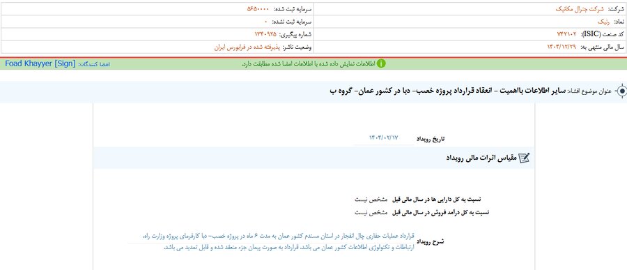 گزارش افشای اطلاعات بااهمیت - (سایر اطلاعات بااهمیت - انعقاد قرارداد پروژه خصب- دبا در کشور عمان- گروه ب) منتهی به سال مالی ۱۴۰۴/۱۲/۲۹ رنیک منتشر شد.