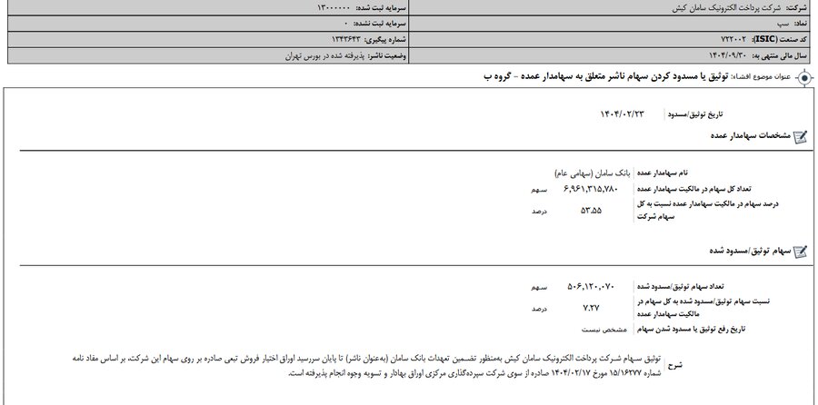 گزارش افشای اطلاعات بااهمیت - (توثیق یا مسدود کردن سهام ناشر متعلق به سهامدار عمده - گروه ب) منتهی به سال مالی ۱۴۰۴/۰۹/۳۰ سپ منتشر شد.