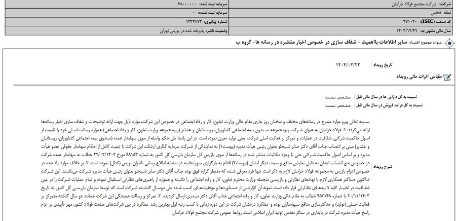 بر اساس انتشار گزارش افشای اطلاعات بااهمیت - (سایر اطلاعات بااهمیت - شفاف سازی در خصوص اخبار منتشره در رسانه ها- گروه ب) منتهی به سال مالی ۱۴۰۴/۱۲/۲۹ فخاس مشخص شد.