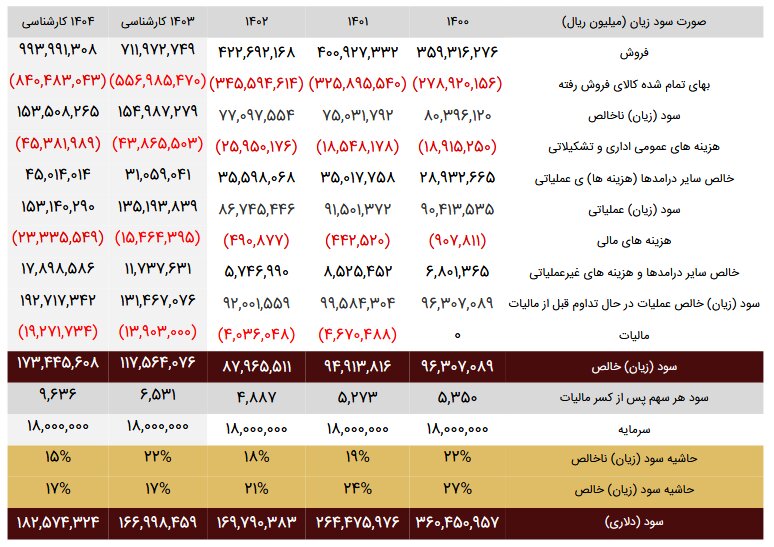 حاشیه سود ناخالص شرکت ۱۵ درصد است و سود عملیاتی شرکت ۱۵۳۱۴ میلیارد تومان اعلام شده است. سود هر سهم پس از کسر مالیات شرکت برای دوره مالی منتهی به ۱۴۰۴ مبلغ ۹۶۳۶ ریال و برای دوره مالی منتهی به ۱۴۰۳ مبلغ ۶۵۳۱ ریال اعلام شده است.