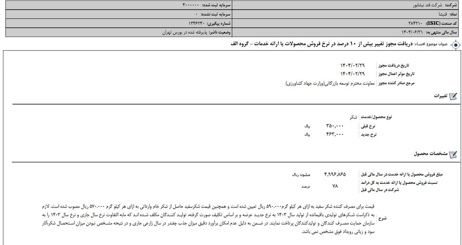 گزارش افشای اطلاعات بااهمیت - (دریافت مجوز تغییر بیش از ۱۰ درصد در نرخ فروش محصولات یا ارائه خدمات - گروه الف) منتهی به سال مالی ۱۴۰۴/۰۶/۳۱ قنیشا منتشر شد.