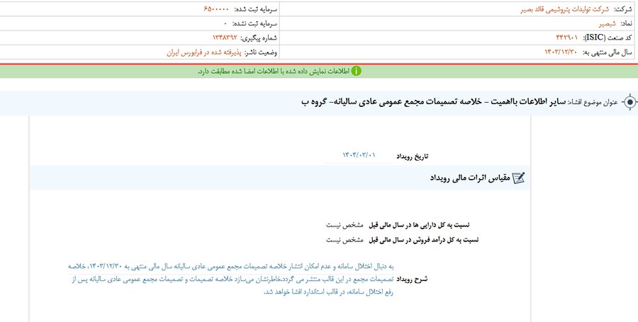 گزارش افشای اطلاعات بااهمیت - (سایر اطلاعات بااهمیت - خلاصه تصمیمات مجمع عمومی عادی سالیانه- گروه ب) منتهی به سال مالی ۱۴۰۳/۱۲/۳۰ شبصیر منتشر شد.