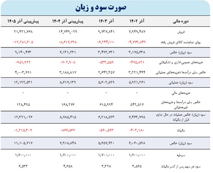 سود عملیاتی شرکت ۱۲۱۹ میلیارد تومان پیش بینی شده است. همچنین سود هر سهم پس از کسر مالیات شرکت برای دوره مالی ۱۴۰۵ مبلغ ۶۵۳۳ ریال است .