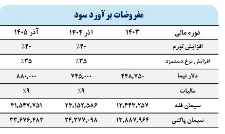 مفروضات برآورد سود شرکت برای آذر ماه ۱۴۰۵ افزایش تورم ۴۰ درصدی، افزایش نرخ دستمزد۳۵ درصدی، سیمان فله ۳۱۵۴۷۷۵۱، سیمان پاکتی ۳۳۶۷۶۴۸۲ است.