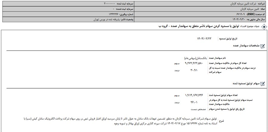 توثیق سهام شرکت تامین سرمایه کاردان به منظور تضمین تعهدات بانک سامان به عنوان ناشر تا پایان سررسید اوراق اختیار فروش تبعی بر روی سهام شرکت پرداخت الکترونیک سامان کیش (سپ) با استناد به نامه شماره ۱۵/۱۶۲۷۷ مورخ ۱۴۰۴/۰۲/۱۷ شرکت سپرده گذاری مرکزی اوراق بهادار و تسویه وجوه است.