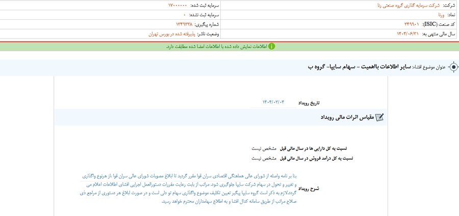 گزارش افشای اطلاعات بااهمیت - (سایر اطلاعات بااهمیت - سهام سایپا- گروه ب) منتهی به سال مالی ۱۴۰۴/۰۶/۳۱ ورنا منتشر شد.