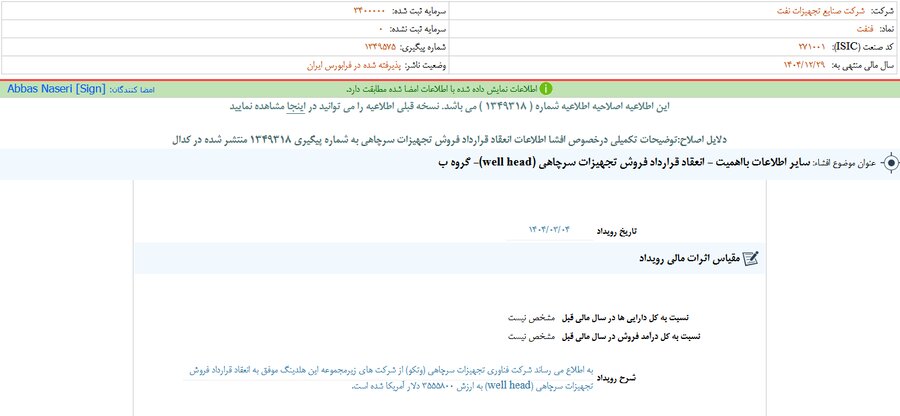 گزارش افشای اطلاعات بااهمیت - (سایر اطلاعات بااهمیت - انعقاد قرارداد فروش تجهیزات سرچاهی (well head)- گروه ب) منتهی به سال مالی ۱۴۰۴/۱۲/۲۹(اصلاحیه) فنفت منتشر شد.