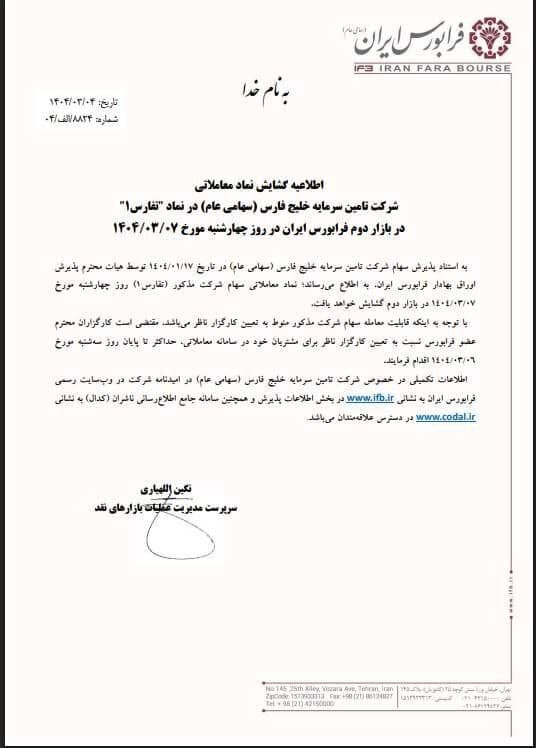 به استناد پذیرش سهام شرکت تامین سرمایه خلیج فارس (سهامی عام) در تاریخ ۱٤۰٤/۰۱/۱۷ توسط هیات پذیرش اوراق بهادار فرابورس ایران به اطلاع می رساند؛ نماد معاملاتی سهام شرکت مذکور (تفارس (۱) روز چهارشنبه ١٤٠٤/٠٣/٠٧ در بازار دوم گشایش می یابد.